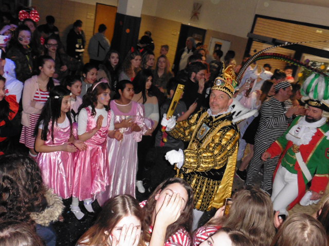 P1020216P1020263P1020296Heute stieg wieder unsere alljährliche Weiberfastnachtsfeier im Foyer der EKS. Bei Minusgraden und Sonnenschein trommelten uns die Mädchen und Jungen der Trommelgruppe von Thomas die Kälte aus den Gliedern und stimmten schon einmal rhythmisch auf die nächsten zwei Stunden ein. Karnevalsmusik und Charthits luden zum Tanzen und Mitsingen ein. Kleine Verschnaufpausen gab es bei den verschiedenen Programmpunkten. Prinz Peter I. von Bergheim zog mit seinem Gefolge ein und grüßte unsere Schule mit einem Karnevalslied. Es war das erste Mal seit vielen Jahren, dass uns die heimischen Tollitäten besuchten. Dies wurde von unseren Schülern mit großem Applaus honoriert. Die Kostümwahl unsere Schüler war in diesem Jahr wieder besonders kreativ. Die Klasse 6a bastelte mit ihrer Klassenlehrerin jeweils ein Dominosteinkostüm – super! Schüler der Stufe 10 zogen sich ungeniert ein Krankenschwesterkostüm an und liefen somit geschlechtergerecht als „Krankenbrüder“ auf. Viele weitere tolle Kostüme konnte man heute ebenfalls entdecken; dazu aber später. Der nächste Programmpunkt war der gekonnt aufgeführte Hip-Hop-Tanz von Schülerinnen der Stufe 5. P1020241P1020243Farbnachbesserungen konnte man sich wie immer im Schminkstudio vornehmen lassen. Dort schminkten Frau Avellino, Frau Khorshidpanah und Frau Schmitz nach Gusto Motive auf die Wangen der Schülerinnen und Schüler. Anna-Melina und Manuel aus der 10B sangen das Lied „Superjeilezick“ von den Brings und brachten somit noch einmal richtige Karnevalsstimmung in den Laden – toller Auftritt! Kurz vor Schluss nahm unsere liebe Moderatorin Frau Illgner dann die Prämierung der besten Kostüme vor. Die Auswahl wurde von Frau Krenzin und Frau Köber getroffen. Wie eingangs gesagt, waren viele bunte, tolle und ausgefallene Kostüme dabei und somit war die Auswahl der besten Kostüme sicherlich nicht ganz einfach. Aber so trafen sich auf der Bühne ein Pilot, ein Schmetterling, zwei Piratinnen, eine weiße Prinzessin, ein afrikanischer Prinz und die besagten Krankenschwestern. Eine tolle Mischung! So ging wieder ein sehr schöner, bunter und außerordentlich stimmungsvoller P1020257Weiberfastnachtsvormittag viel zu schnell vorbei.